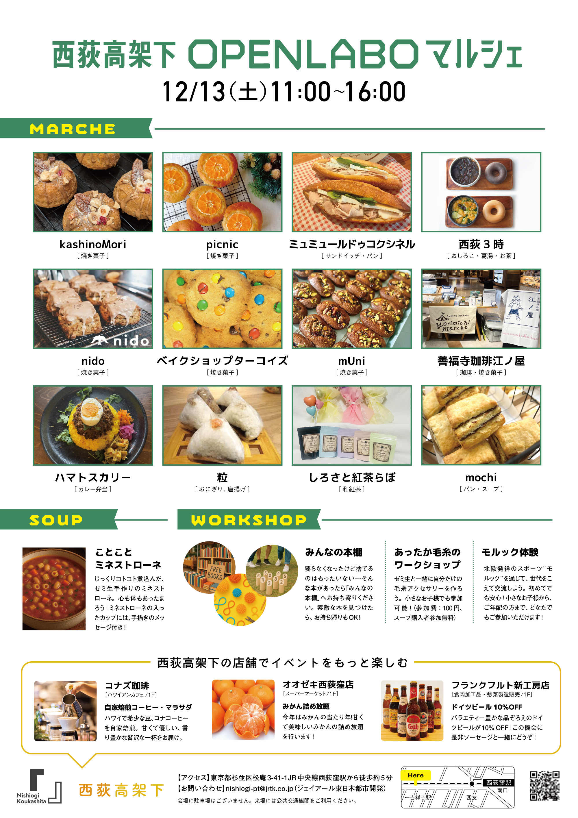 西荻高架下では、12月13日(土)、2F広場および緑道にて、食物販を中心とした地域連携マルシェイベントを開催します。みなさまの商品の他、会場には常設の滞留スペースとしての飲食スペース、子どもも楽しめるワークショップといった高架下でゆっくり過ごせる雰囲気づくりも行います。